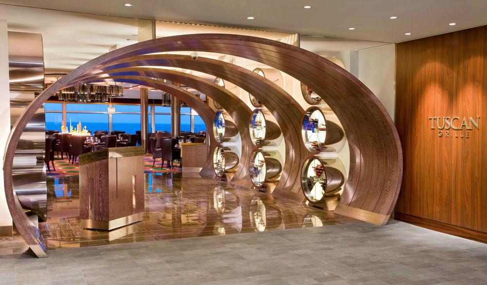 As the main dining room on board the Celebrity Solstice, the two-story Grand Epernay is a modern take on the golden years of Hollywood. The room features soft pink and white lighting, crisp table linen and a sweeping staircase down from the mezzanine floor on which Audrey Hepburn herself wouldn’t look out of place making an entrance. You can opt to dine each night at one of two sittings, or take your chances as a walk-up. The menu is modern cuisine with fourteen menu cycles, so unless your cruise is longer than fourteen days you won’t see the same selection twice. A smart casual dress code applies.